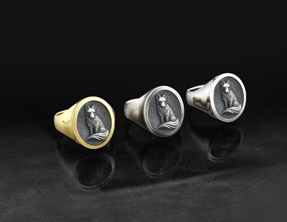 Fox Mens Signet Ring Gold Coated Shiny Silver And Oxidized Etsy