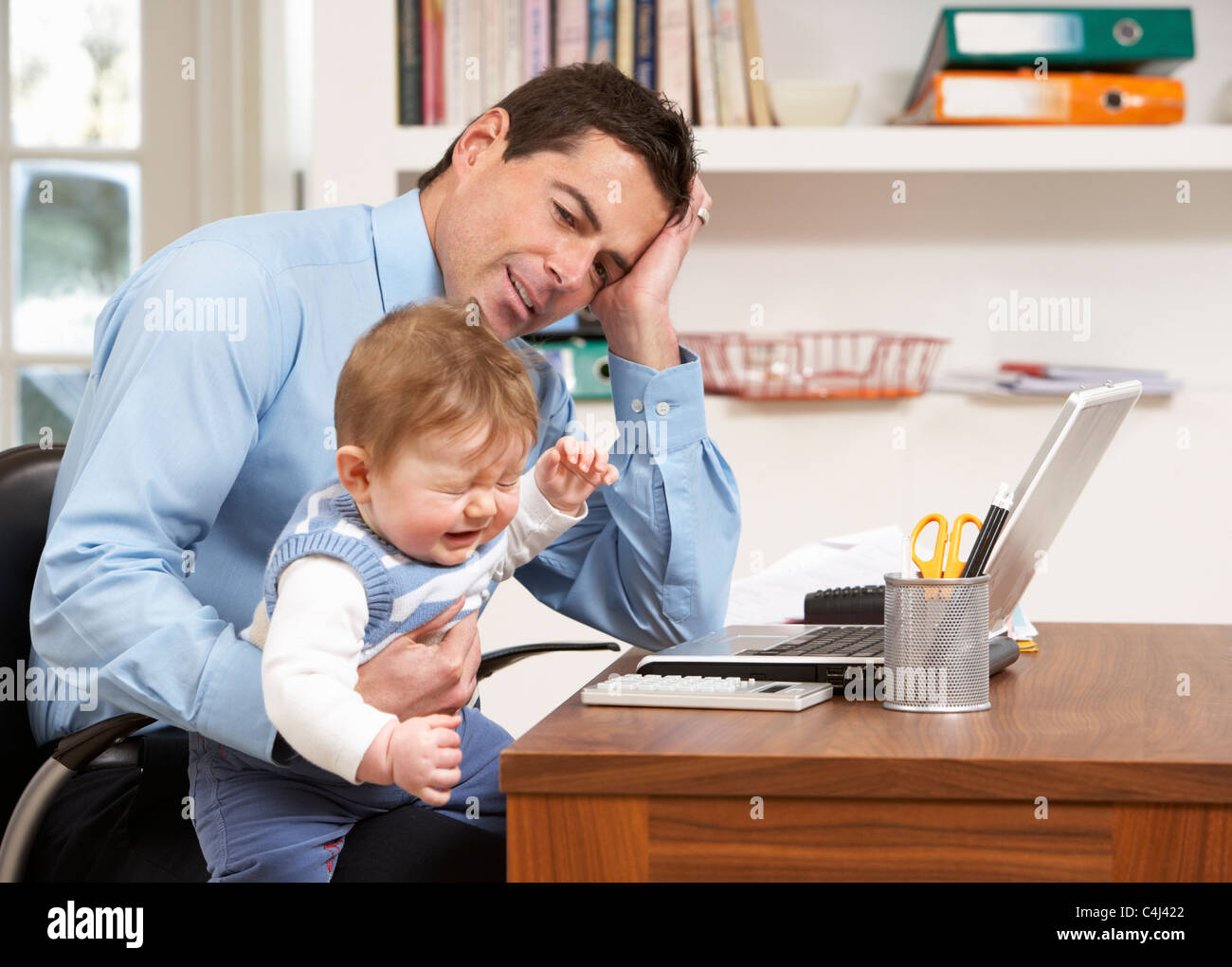 Stressed Man With Baby Working From Home Using Laptop Stock Photo Alamy