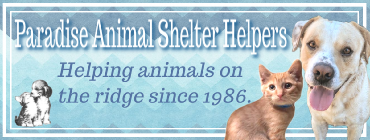 Animal Services encompases animal control and animal sheltering and is responsible for enforcing all City animal related ordinances and state laws including picking up dogs running at large and quarantining animals for Rabies observation. To ensure the humane treatment of animals both wild and domestic and to provide a safe shelter for lost and homeless pets while they find their way home. Paradise Animal Shelter Helpers has been helping animals on the Paradise Ridge since 1986.