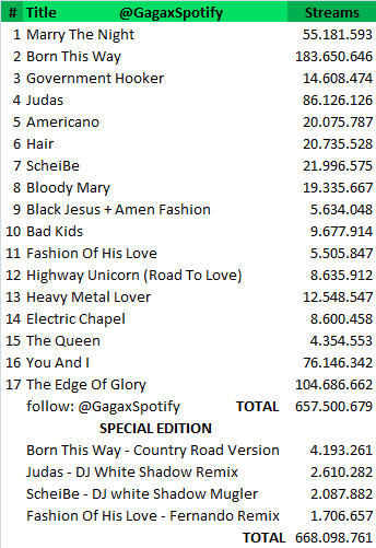 Gaga Spotify On Twitter Ladygaga S Born This Way Album Including Special Edition Songs Spotify Streams 10 06 10 20 Total Streams 668 098 761 7 085 451 Follow Us Gagaxspotify Https T Co Kupfpdte80