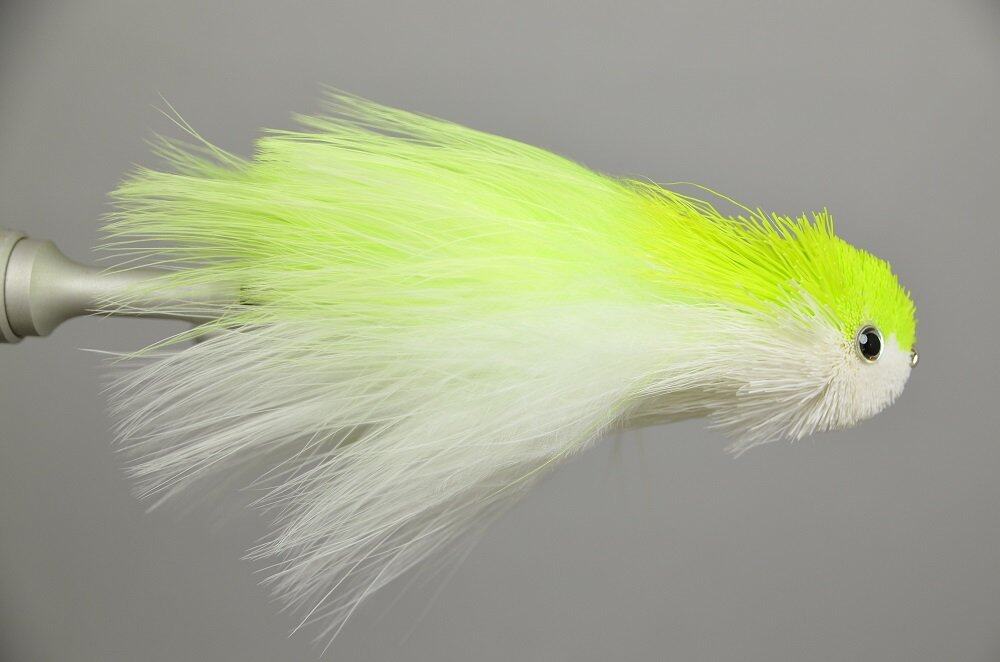 Fished near the surface the Swimmin Jimmy imitates a wounded baitfish with its deer hair head. This patten imitates a wounded fish and moves in erratically due to the deer hair head. I tie a few bugs kinda like this with syn fibers spun in a dubbing machine to get the layer effect.